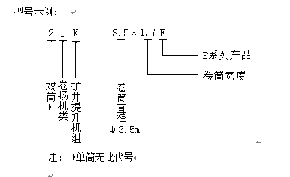 本產(chǎn)品執(zhí)行中華人民共和國機(jī)械工業(yè)部標(biāo)準(zhǔn)JB/T2646-1992《單繩纏繞式礦井提升機(jī)型式基本參數(shù)與尺寸》,其型號表示方法符合中華人民共和國機(jī)械工業(yè)部JB1604—1998《礦山機(jī)械產(chǎn)品型號編制方法》的規(guī)定。