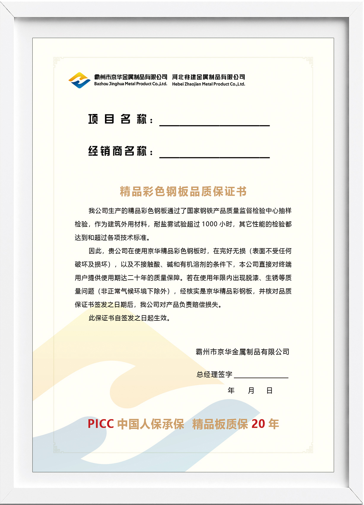 精品彩色鋼板品質(zhì)保證書(shū)