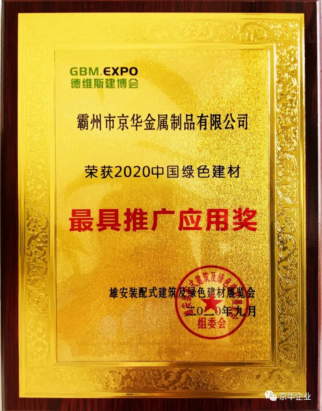 雄安德維斯建博會作為雄安新區(qū)的標(biāo)桿性展會,會上,京華企業(yè)以卓越的產(chǎn)品質(zhì)量和先進(jìn)的生產(chǎn)技術(shù)以及標(biāo)準(zhǔn)化的銷售服務(wù)榮獲2020中國綠色建材“最具推廣應(yīng)用獎”。