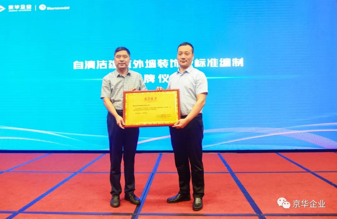 來自中國建材規(guī)劃院應用技術(shù)開發(fā)研究院/中關(guān)村人居環(huán)境工程與材料研究院副院長王忠勇先生就綠色建筑及綠色建材課題向現(xiàn)場嘉賓進行了分享,并向京華企業(yè)授予 “自清潔建筑外墻裝飾板標準編制” 榮譽牌,對京華企業(yè)參與建筑板材生產(chǎn)標準編制表示鼓勵與肯定。